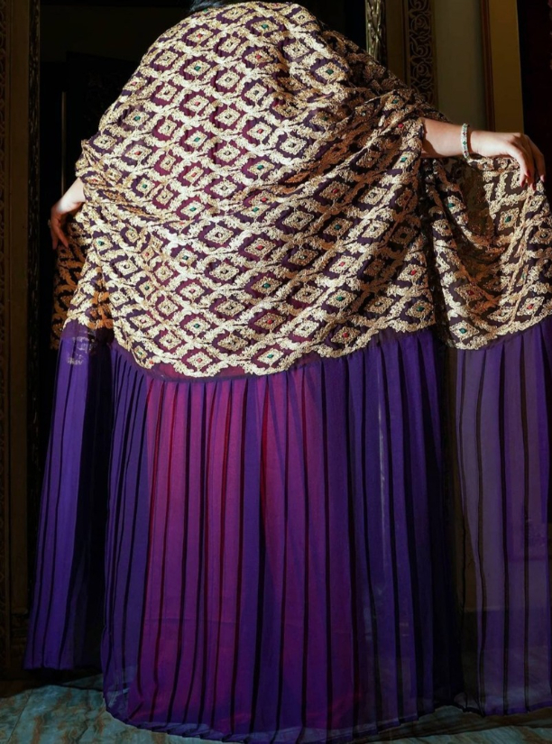 Al Malika set ,2 pieces , plain dress with golden zaree and colourful cristal embroidery cape