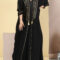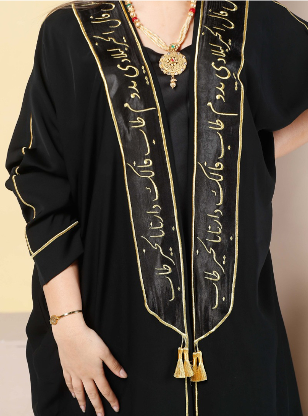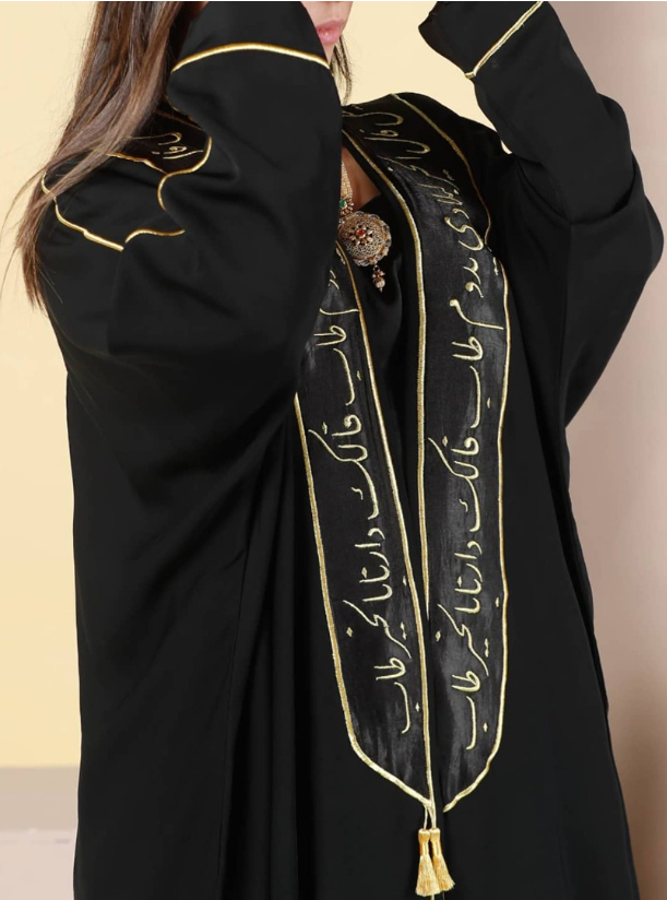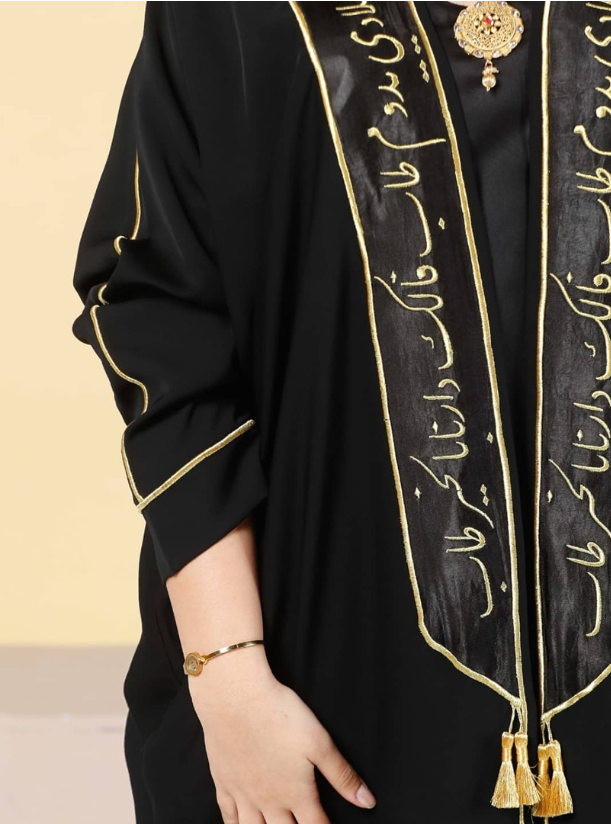 Black Abaya featuring an embroidered collar with tassels, etched with poetry.