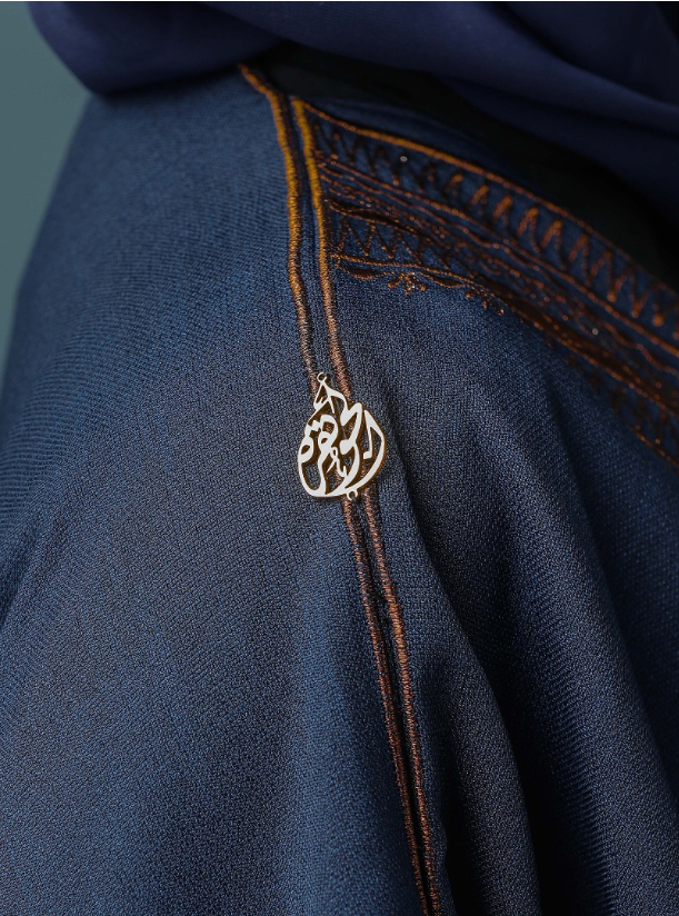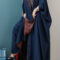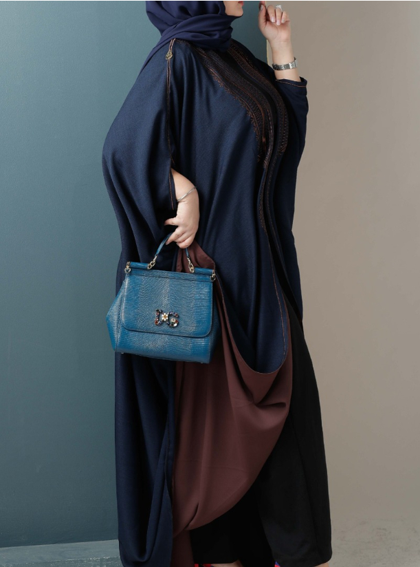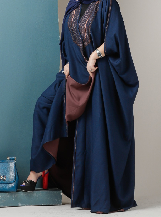 Navy blue Queen bisht featuring a billowy sleeves with embroidered neckline.