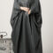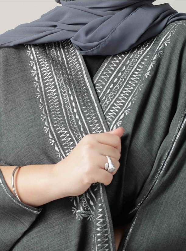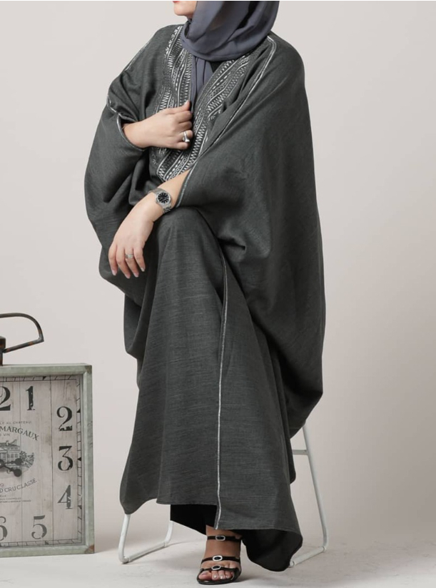 Grey bisht abaya featuring a billowy dolman sleeves with embroidered neckline.