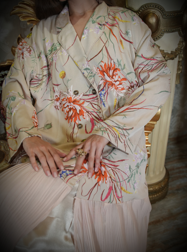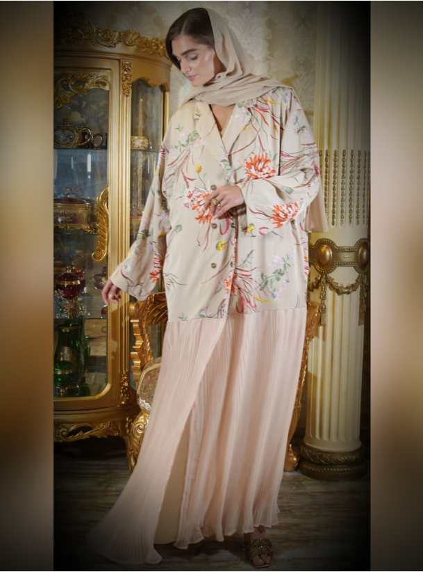 Item fabric : airflow crepe with pleated Chiffon headscarf Included : No Belt Included : No Garment Care : Dry Clean Designer note : Exclusive unique piece